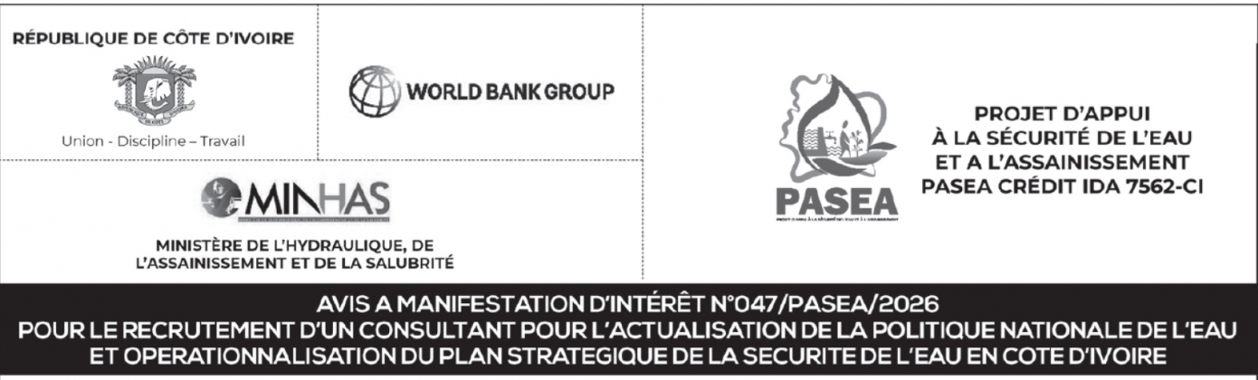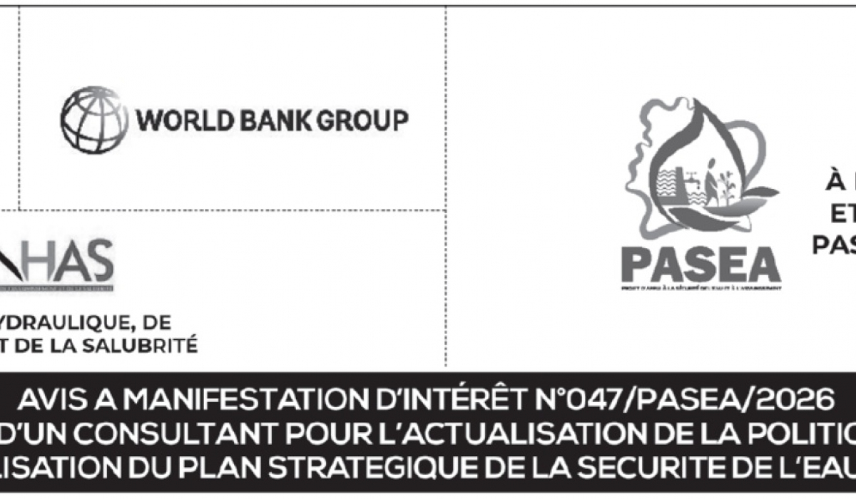 AVIS A MANIFESTATION D'INTERÊT N°047/PASEA/2026 POUR LE RECRUTEMENT D'UN CONSULTANT POUR L'ACTUALISATION DE LA POLITIQUE NATIONALE DE L'EAU ET...